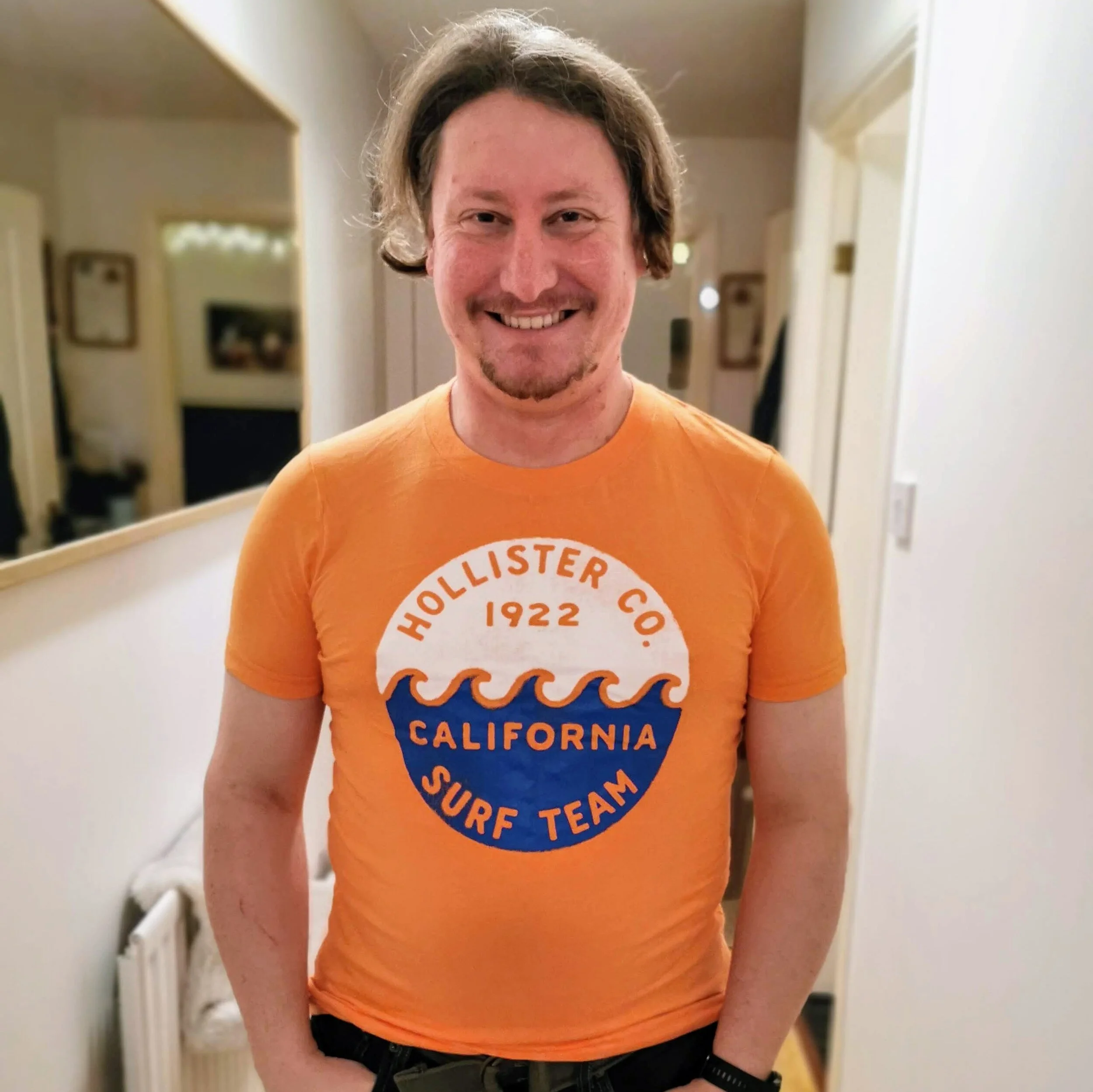 California, next week. We can’t wait until our next vacation (flying KLM obviously). In the run up I’m wearing my Hollister t-shirts and setting up for tomorrow’s orange t-shirt by wearing this one.